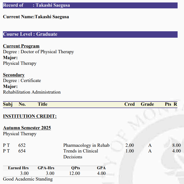 今年度入学しました、米国 モンタナ大学(University of Montana)の理学療法ドクタークラス1年前期課程をおかげさまで修了する事ができました!